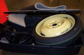 Maker Faire Photos, Day 1, Removed pieces, storage compartment (left side+cover, main+cover, left side cover), spare tire & jack, the carpet can go back in over new battery box and electronics.